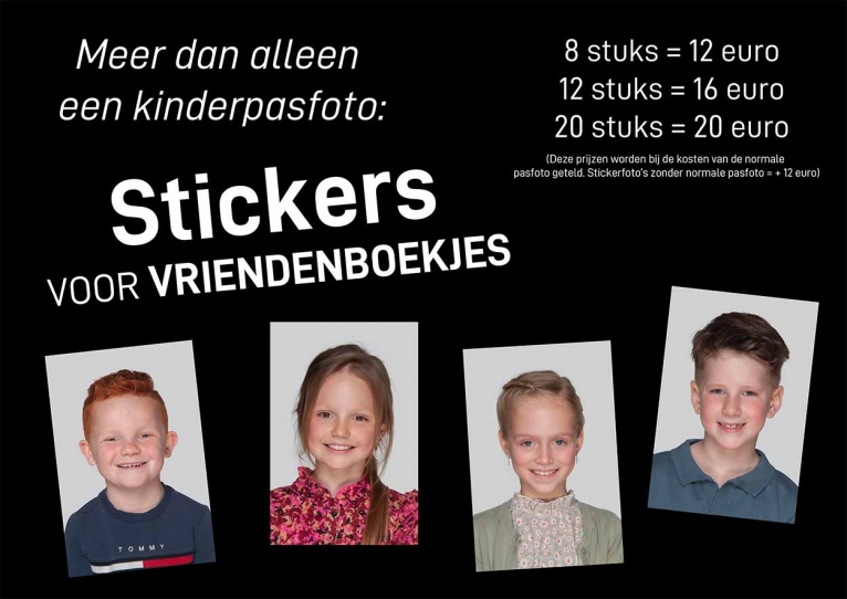 Wanneer jouw kind pasfoto’s komt laten maken, bied ik iets extra’s: naast de gewone set pasfoto’s kan ik een lachende versie maken waarvan we vrolijke stickers laten drukken. Deze stickers zijn ideaal om in een vriendenboekje te plakken, mee te geven aan vriendjes of om gewoon te bewaren als leuk aandenken.